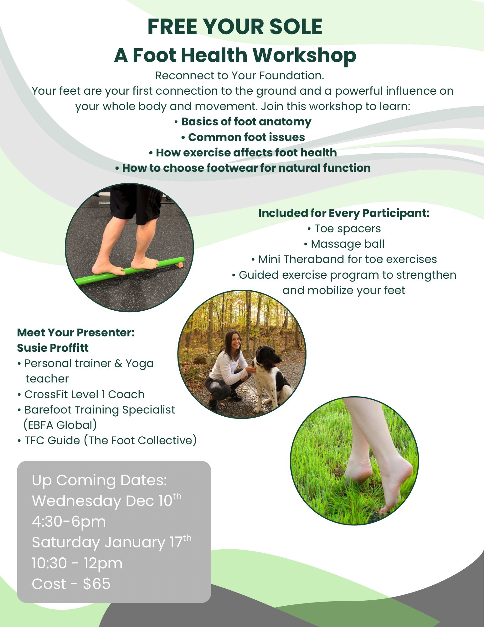 Session registration includes a foot restoration kit (toe spreaders, massage ball, mini band – $35 value) and an exercise program for your feet and lower legs.