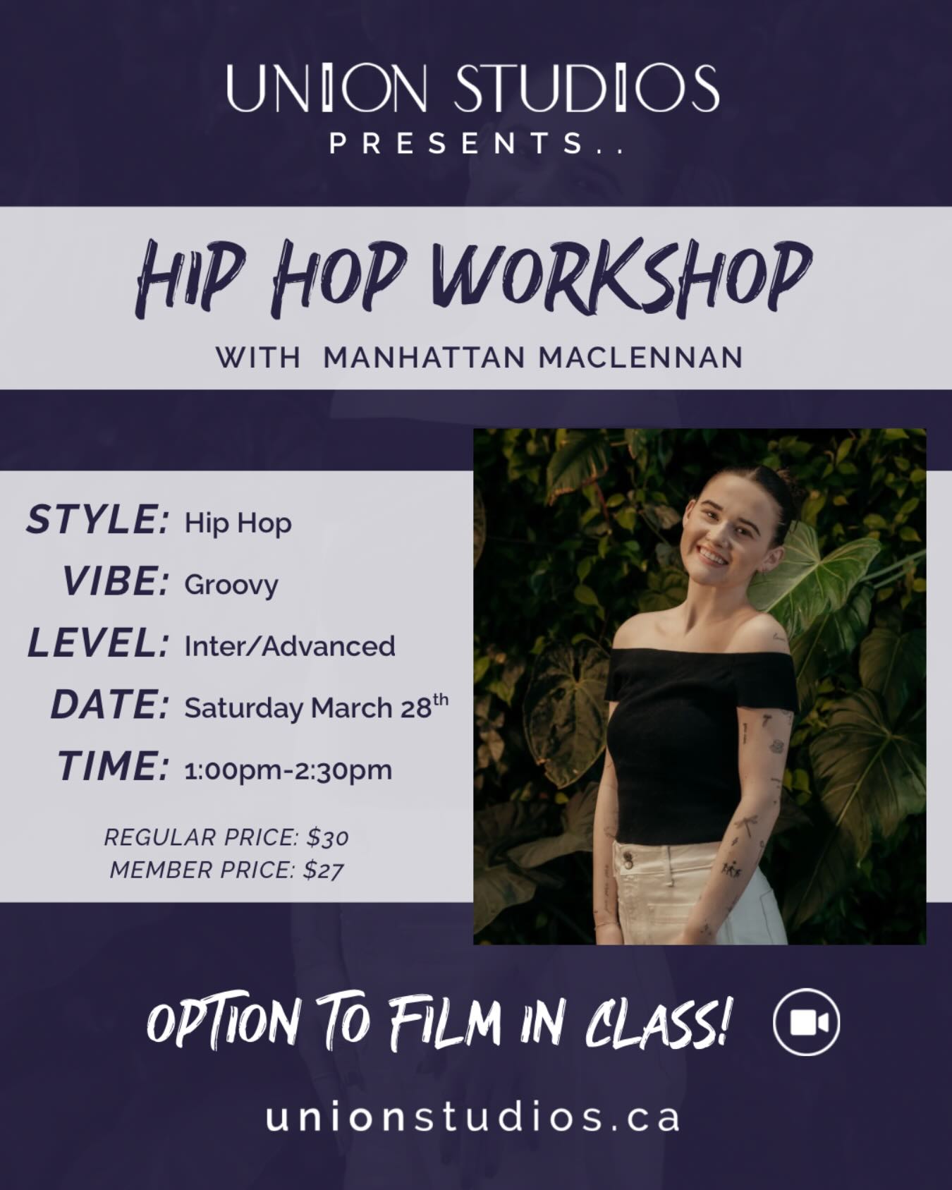 This intermediate/advanced hip hop workshop focuses on a dynamic combo while building performance and confidence in a fun, supportive space. We’ll wrap up the session with time to film so you can capture the choreography and have some fun with it.