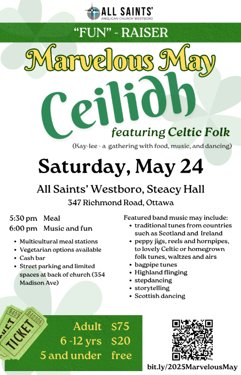 All Saints’ Anglican Church is holding a Ceilidh (kay-lee) on May 24th! This will be an ambitious and audacious fundraiser to reach the target of $10,000 to help with their deficit and start building back a reserve for a rainy/snowy day.