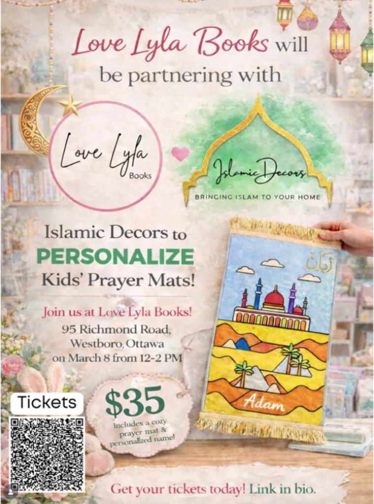 We are partnering with Islamic Decors to bring you a special in store experience where your child can receive a cozy prayer mat customized with their name. A beautiful way to make salah feel personal and exciting.