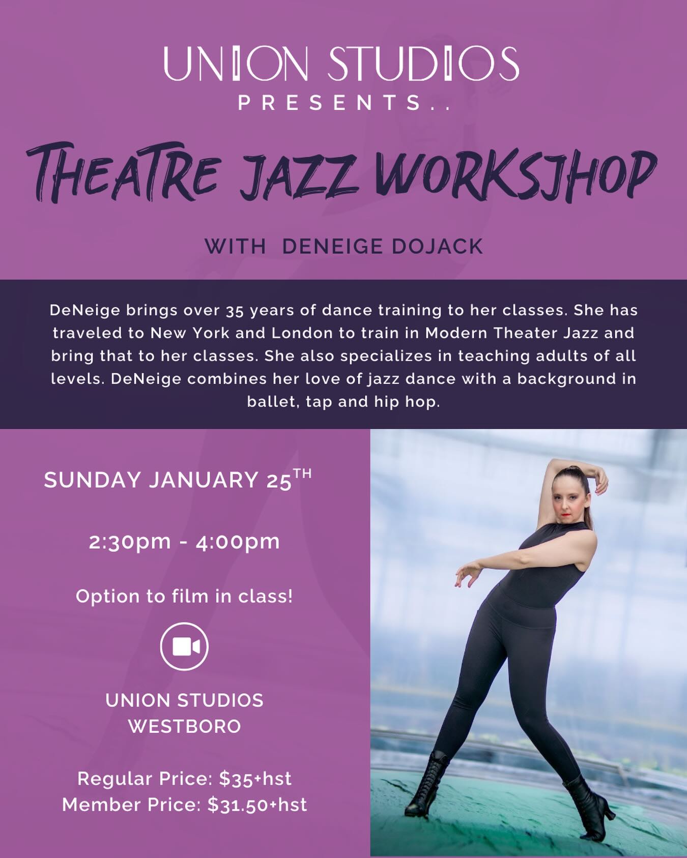 We’re thrilled to welcome DeNeige for a Theatre Jazz Workshop at Union Studios! Don’t miss this opportunity – and wear your character heels if you like!