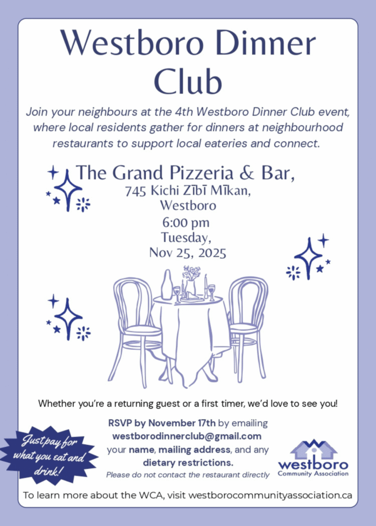 The Westboro Community Association has officially launched the Westboro Dinner Club, where local residents gather for casual dinners at neighbourhood restaurants to support local eateries and connect with each other.