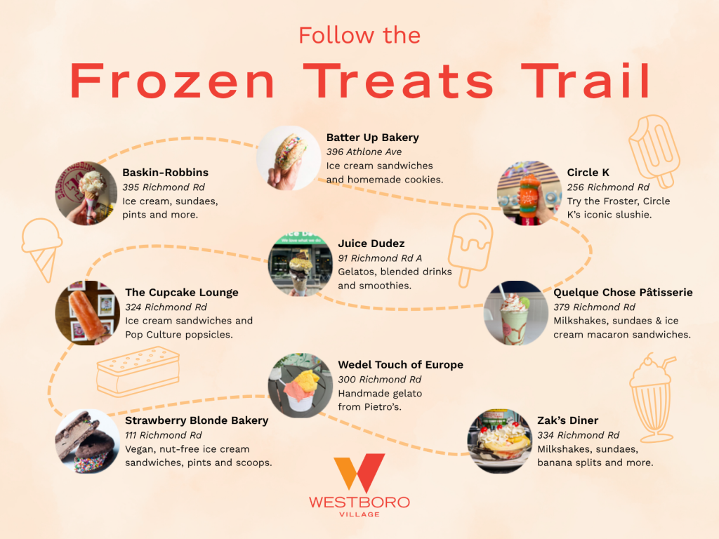 From ice cream to gelato, popsicles to slushies and more, Westboro Village is the destination for frozen treats that will keep you cool all summer long. Save the trail below or keep scrolling to learn more about what each stop has to offer!