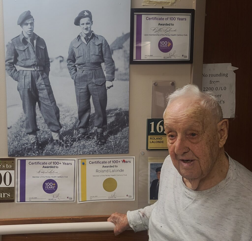 When the war ended, Roly returned home to a hero’s welcome in Ottawa, greeted by family and friends who carried him on their shoulders through the streets in celebration. He went on to serve two additional five-year terms with the Governor General’s Foot Guards, earning the Canadian Forces Decoration and the rank of Warrant Officer.