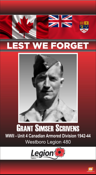 Grant Simser Scrivens, born in Ottawa on March 19, 1919, was the third child of Samuel and Cordelia Scrivens to serve in WW2. Grant enlisted to assist in the war effort. While en route to Europe his transport ship was torpedoed by a German Uboat — obviously not a great way to start your military service; he spent several hours in the frigid Atlantic waters before being picked up. Dad met and subsequently married my mother (Henriette) while still stationed in the Netherlands with the Canadian Armored Division; and, upon discharge they returned to settle in Ottawa. Mom and dad had a total of 3 children and are survived by myself (Jim), and my sister Sheila. Sadly my dad passed away in 1988 at the early age of 69.